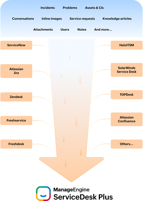 با مهاجرت استاندارد، تمام داده‌های حیاتی عملیاتی-از درخواست‌ها و مشکلات گرفته تا دارایی‌ها، CMDB، مستندات و فایل‌های پیوست- به شکلی یکپارچه به ServiceDesk Plus منتقل می‌شوند.